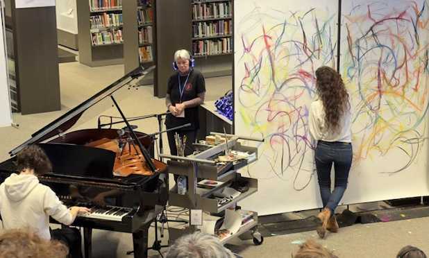 Cy Mirol captures the resonant energy of music through her drawings and paintings which she calls as writing as well, embodying the fluid, syneasthetic alphabet she has created for Bookperformance that is holding space for life’s unfolding. This alphabet is distinguished by its sound and meaning values, complementing other alphabets she knows and continues to study. Her artwork, showcased on paper and canvas, has been featured in various literary and art festivals, as well as during her Bookperformance events from 2011 to 2021. In 2021, her paintings inspired by classical music composer Satie, Gymnopédies were displayed in the context of the BILY Art Walk. Following this, she exhibited works based on other musical compositions, including Hallelujah (by Cohen) on paper and linen, A Love Supreme (by Coltrane) live-painting performance on linen, Liebesträume (by Liszt) live-paining performance on paper, Boléro (by Ravel) on paper and linen, Blue Train (by Coltrane) on skateboards, and Time Lapse (by Einaudi) on hand made papers. Cy creates in solitude while listening to music and also conducts live-painting performances in public spaces. These live events, similar to her books and performances, encourage co-creation by inviting participants to get involved in the artwork, which she later authenticates. Each autumn, she paints Hallelujah pieces as a tribute to: "we are all one". Below is a list of exhibitions since 2021. You are invited to visit @bookperformance, an evolving digital archive providing audiovisual and textual documentation of the exhibited artworks.