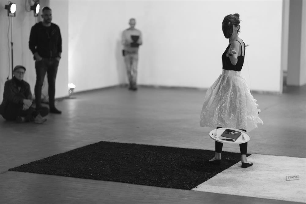 “The book, here and now, with its author and reader, either uttered or silent, is a performance. Bookperformance is a naked, fixed and textual body. If movement is impossible for a fixed body, to turn the impossible into the possible, it is necessary to attempt the weird and the absurd. In order to successfully attempt the weird and the absurd, you must possess not only a considerable intelligence but also an extraordinary courage for realizing and accepting the significant power of the weird and the absurd. To be able to do all these it is necessary to be a good reader”. Bookperformance Manifesto, principle 1/7