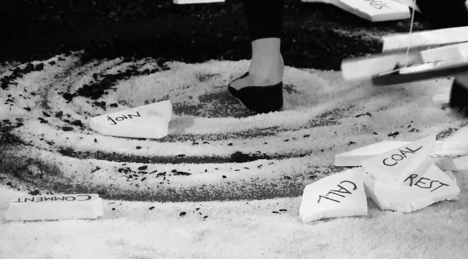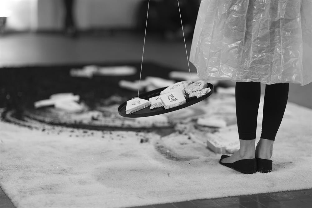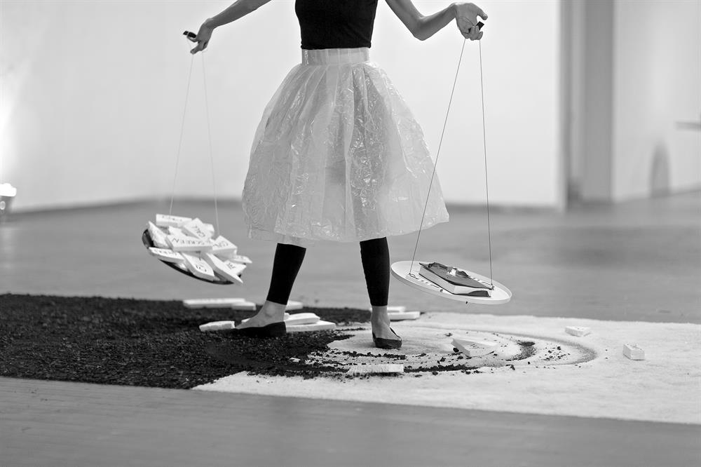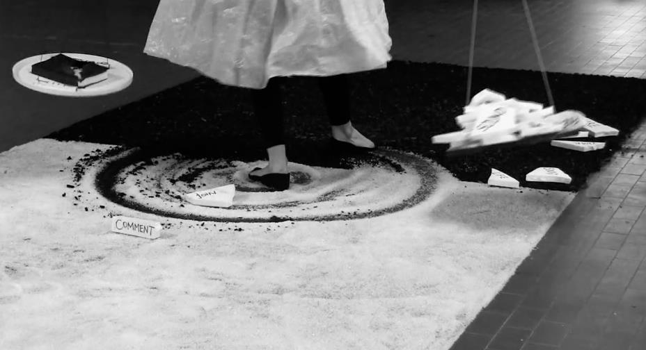 The construction of the pages on the floor was a long durational perfromance of 8 hours, involving crusing coal and salt stones into powders, and created thr material such as words on the round boards, boards themselves, and the mask. Upon this praparetion the Bookperfromance itself took 30 minutes.